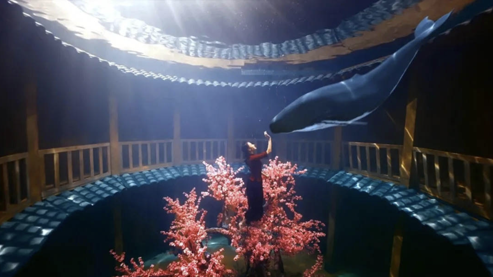 이뿐만이 아닙니다. 2017년 개봉한 애니메이션 영화 <나의 붉은 고래>에서 영감을 받은 공연도 있었습니다. 바로 고래와 함께 물속에서 유유히 헤엄치는 퍼포먼스를 선보인 것이죠. 이 장면은 CGI로 완성된 것이었는데요. 중국 푸젠성에 있는 유명한 중국 전통 가옥인 툴루의 안뜰에서 고래와 인간이 교감하는 모습을 영상으로 선보였습니다.