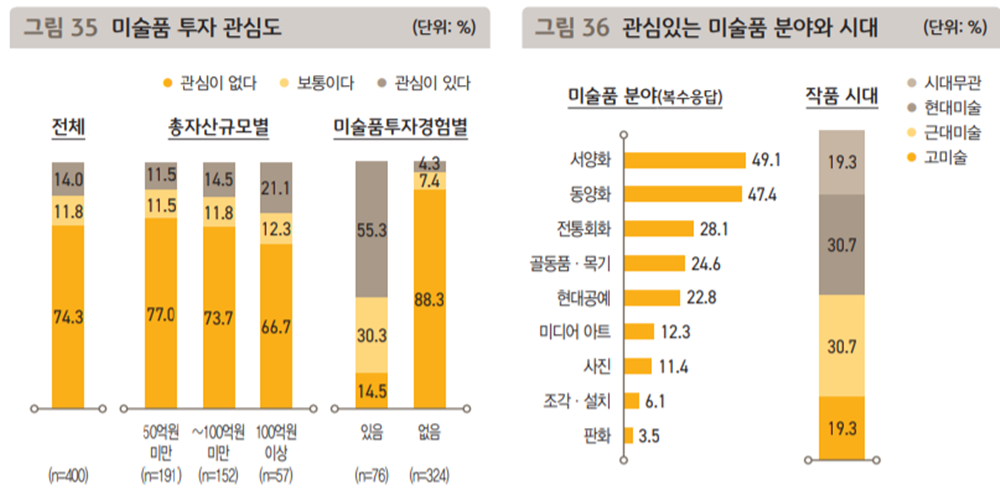 이어 '투자보다는 개인 소장 목적이라서' '미술품 구매 후 재판매가 어려워서' '미술품 가격 하락이 우려되어서' '투자할만한 작가, 작품이 없어서' '투자자 보호 수단이 미흡해서' '투자자금이 부족해서' 등의 답변도 보입니다.