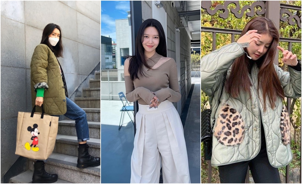 일명 '깔깔이 패션'이라고도 불리는 퀼팅 재킷 또한 인스타그램 속 인기 패션 아이템입니다. 특히 심플한 카키 컬러의 퀼팅 재킷을 입고 등장한 연예인들이 많이 있었는데요. 손나은, 크리스탈이 멋스러운 퀼팅 재킷 스타일링을 보여줬네요.