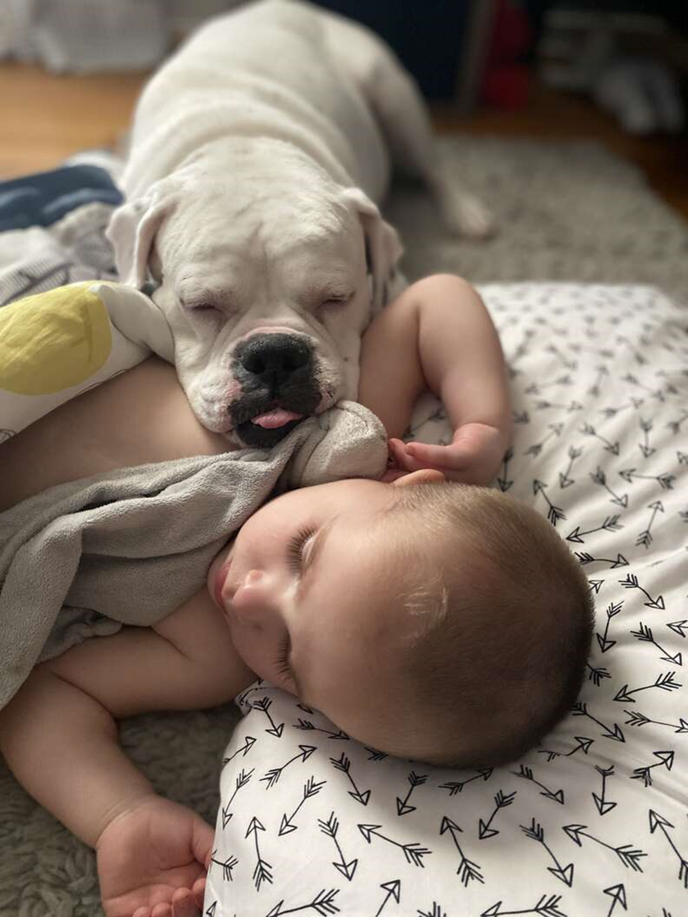 핀이 유아용 침대를 벗어나 싱글 침대로 옮겼을 때는 브루투스도 자연스럽게 침대 위로 올라갔다고 합니다. 그리고 마치 핀이 침대에서 굴러 떨어지는 것을 막기 위해 옆으로 누운 것 같았다고 합니다.