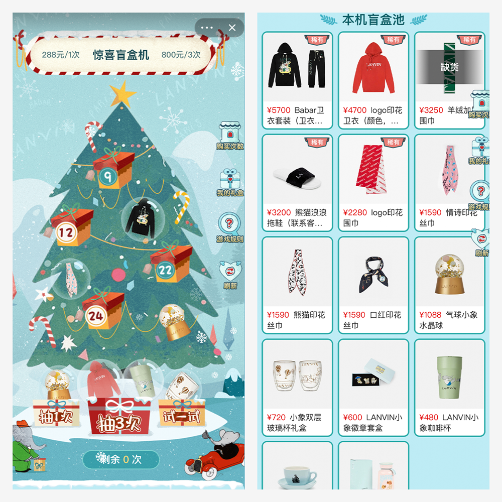 블라인드 랜덤 박스를 잇따라 성공시킨 랑방. 이번에도 또 랜덤 박스를 내놓았습니다. 크리스마스 연휴를 맞아 티몰 플래그시비 스토어에 블라인드 박스 콘셉트의 미니 프로그램을 출시한 것이었죠.. 온라인 쇼핑객들은 288위안, 우리 돈으로 약 5만 3,000원을 내면 블라인드 박스 하나를 뽑을 수 있으며, 800위안, 우리 돈으로 약 14만 8,000원을 지불하면 블라인드 박스 세 개를 뽑을 수 있는데요. 블라인드 박스에는 컵, 크리스털볼, 후드 티셔츠, 캐시미어 스카프 등이 포함되어 있습니다.