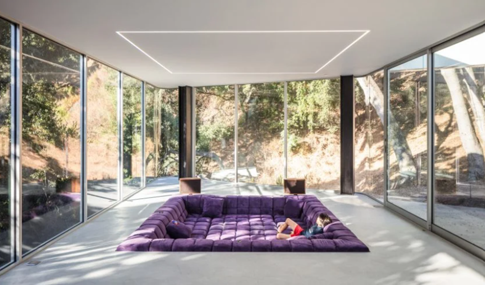 눈길을 확 사로잡는 보라색 소파가 특징적인 집입니다. 이곳은 미국에 있는 주택의 거실인데요. 독특하게 아래로 공간을 만들어 대형 소파를 설치해둔 것이 특징적입니다. 이곳에서는 산타 크루즈 산맥의 절경을 볼 수 있습니다.