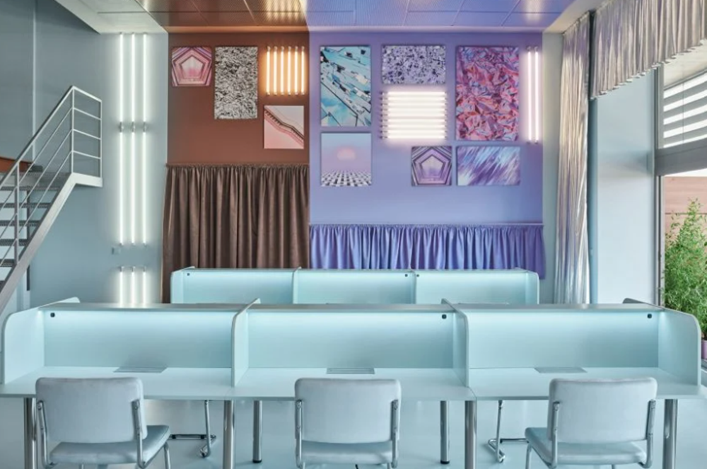 스페인의 한 공유 오피스입니다. 벽에는 파스텔 보라 색상이 있는데요. 이곳의 전반적인 차가운 분위기를 조금이나마 따뜻하게 만들어주고 있는 것 같습니다.
