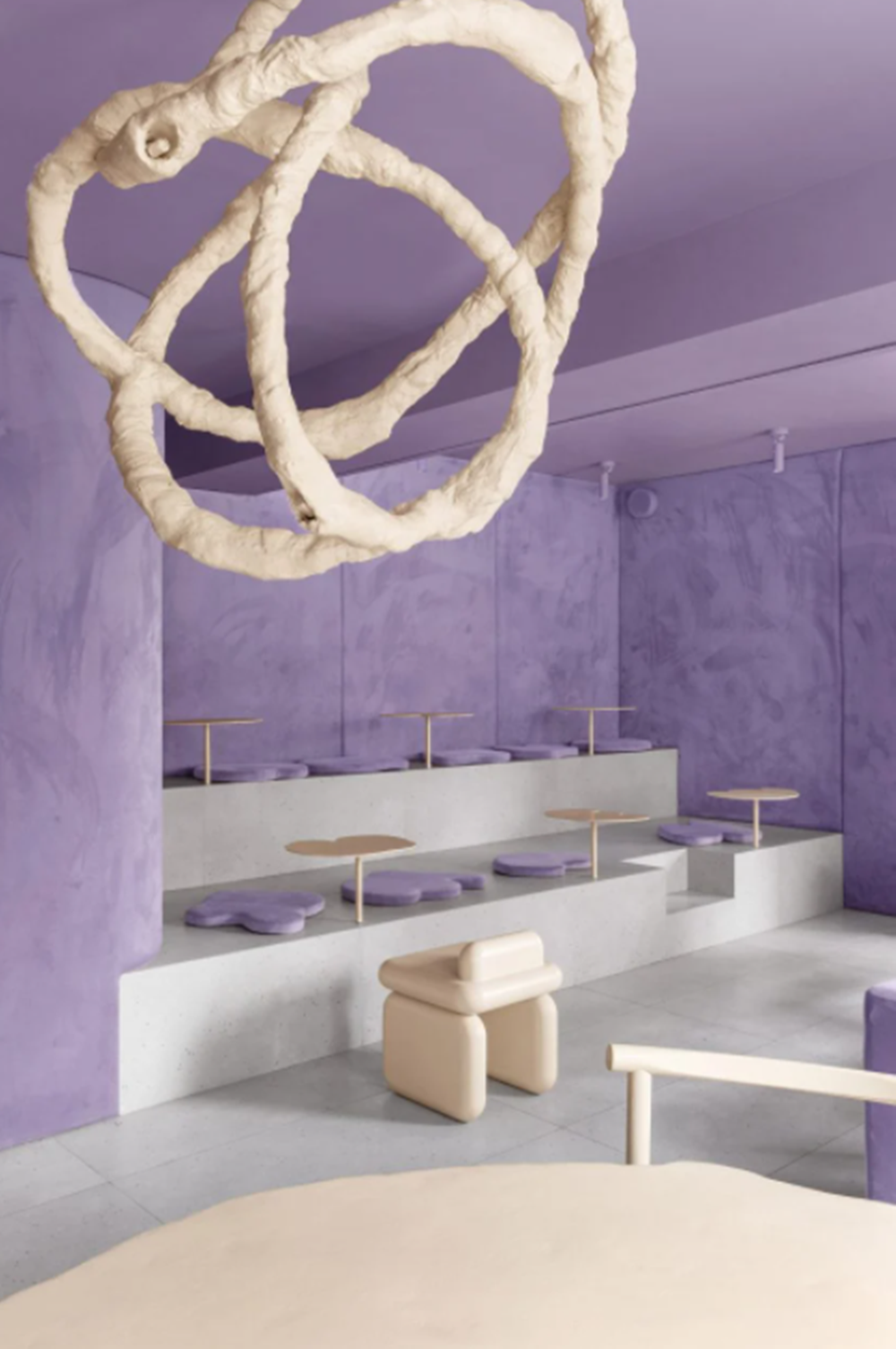 러시아의 한 카페 디자인입니다. 카페의 벽면은 라일락 컬러로 덮여 있는데요. 비현실적인 느낌까지 자아내는 공간입니다. 이곳은 도넛을 파는 곳이라고 하는데요. 이에 도넛 반죽을 나타내는 조명까지 설치해 독특함을 더하고 있네요.