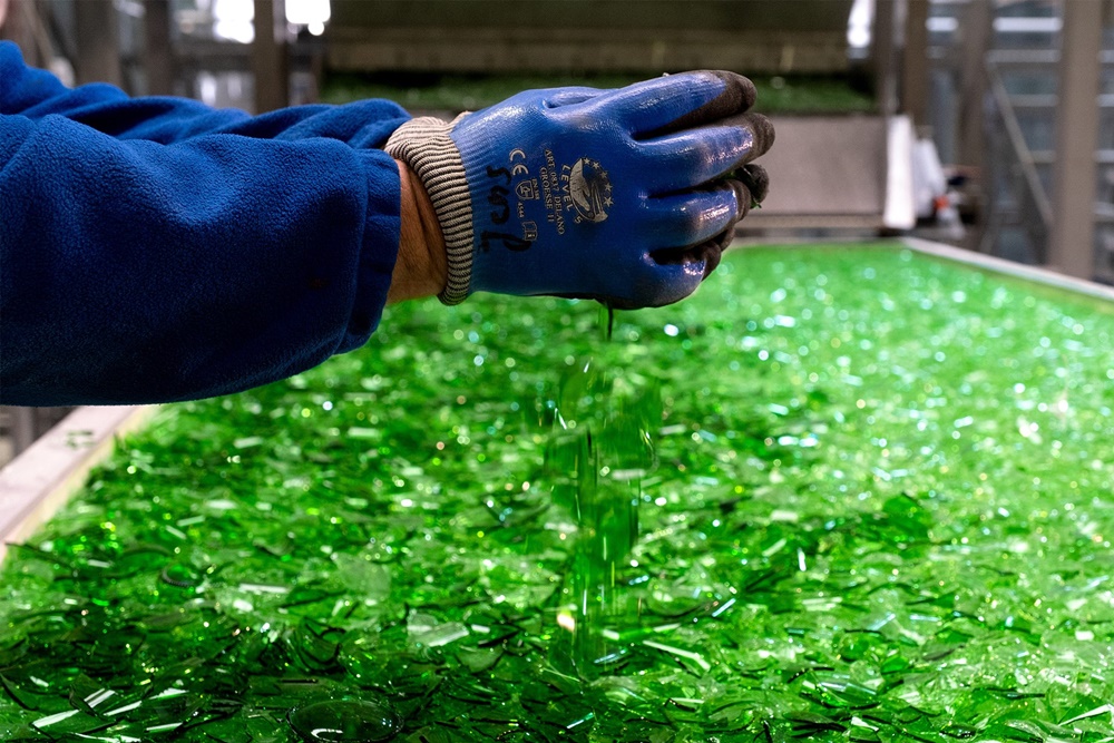 샴페인 병을 깨서 만든 이 초록색 소재는 은은한 광택을 보여주고 있으며 밤에는 화려하게 빛나고 있는데요. 독일 토이췐달에 위치하고 있는 한 공장에서 직접 만들고 있습니다. 그리고 이 파사드가 철거된 이후에도 또다시 재활용할 수 있다고 하네요.