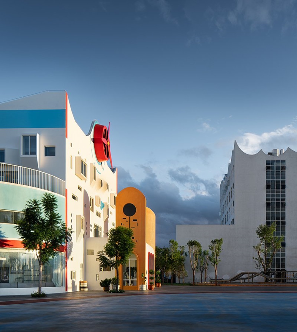 먼저 유치원의 입구를 보면 그냥 평범한 건축물인 것처럼 보입니다. 세 개의 빨간 아치문이 아이들을 반겨주고 있고, 갖가지 형태로 난 창문들이 있으며 양옆으로는 발코니가 보이죠. 유치원의 입구에서 보면 건물 위쪽에 빨간 프로펠러 하나가 설치되어 있는데요. '독특하다'는 생각이 듭니다. 그러나 이 건축물을 위에서 보면 이 빨간 프로펠러가 여기에 왜 붙어있는지 알 수 있습니다. 바로 건축물이 비행기 모양이기 때문입니다. 그리고 유치원의 입구는 비행기의 뒤쪽이 되는 것이죠.