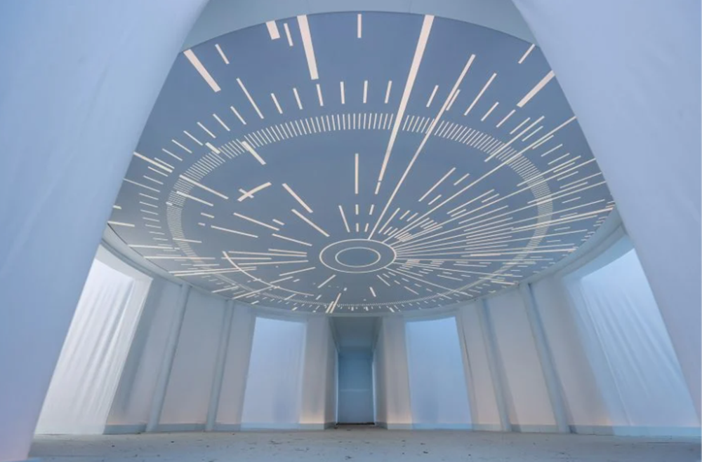 중앙 플랫폼은 마치 해시계와 같은 모양입니다. 이 구불구불한 모양은 향수 분자가 증발하는데 걸리는 시간을 반영하고 있다고 하네요. 중앙 플랫폼의 안쪽으로 들어가면 천장에서 독특한 모양의 장식을 볼 수 있는데요. 이는 향수의 정보를 추상적으로 표현한 것이라고 합니다. 또한 데블린은 샤넬의 조향사와 협업해 넘버5 향수의 분자 언어를 음향과 설치물로 바꾸는 작업을 했다고 하네요.