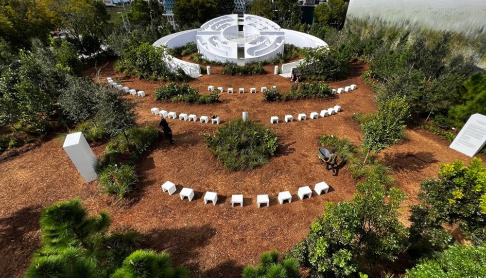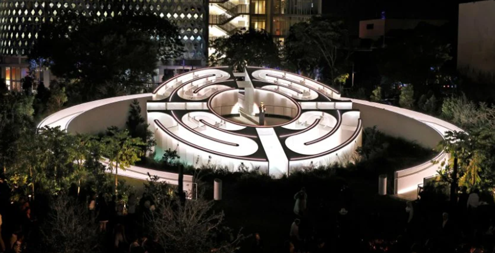 이 구조물은 영국의 디자이너 에스 데블린(Es Devlin)이 설계한 것입니다. 이 구조물의 이름은 '파이브에코즈(Five Echoes)인데요. 파이브에코즈는 마이애미의 디자인 디스트릭트에 위치하고 있죠. 이 구조물의 기본적인 골격은 '원형 미로'인데요. 오르막길 복도가 양쪽으로 나있고, 이 오르막 복도를 다 올라가면 중앙에 우뚝 솟은 플랫폼으로 갈 수 있습니다. 그리고 이 플랫폼은 미로의 형태를 하고 있는 것이죠. 그리고 이 미로의 주변으로는 크고 작은 나무 2천 그루 이상이 심어져 있습니다.