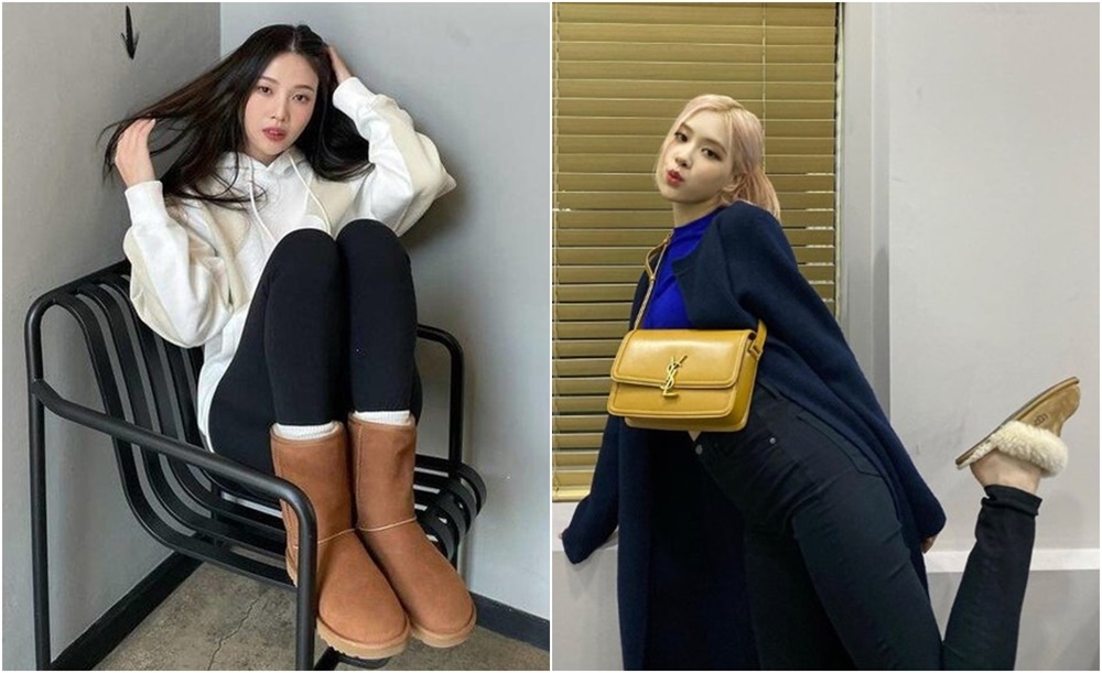 일명 '로제 어그'라고 불리며 큰 인기를 얻고 있는 이 제품. 바로 어그 스커페트입니다. 전체적으로 어두운 색상으로 스타일링하고 어그 스커페트를 신었는데요. 편안하면서도 귀여운 스타일링입니다.