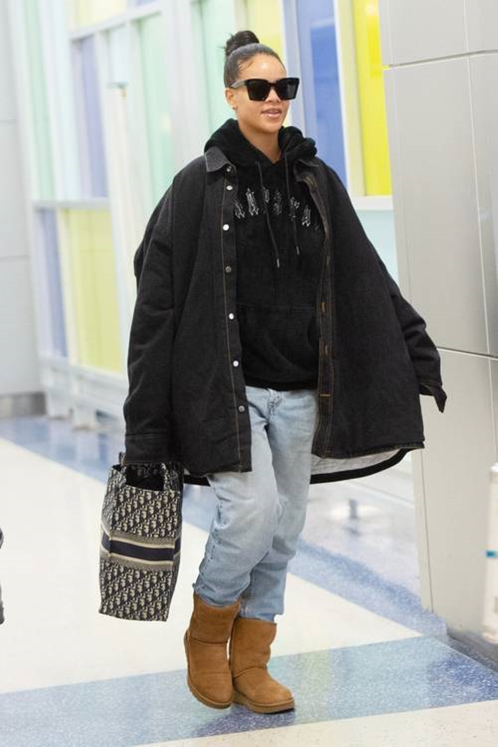할리우드 대표 사복 장인 리한나는 클래식한 어그를 선택했습니다. 라프 시몬스의 오버사이즈 데님 셔츠재킷에 트랩 스타 런던의 후디, 그리고 디올의 북토트를 들고 어그 클래식 투 쇼트 부츠를 선택했네요. 후드도, 재킷도, 청바지도 헐렁한데 머리만 단정하게 올려 묶은 모습이 매우 멋스럽습니다.
