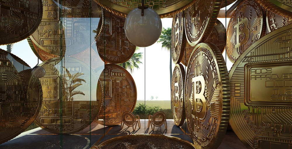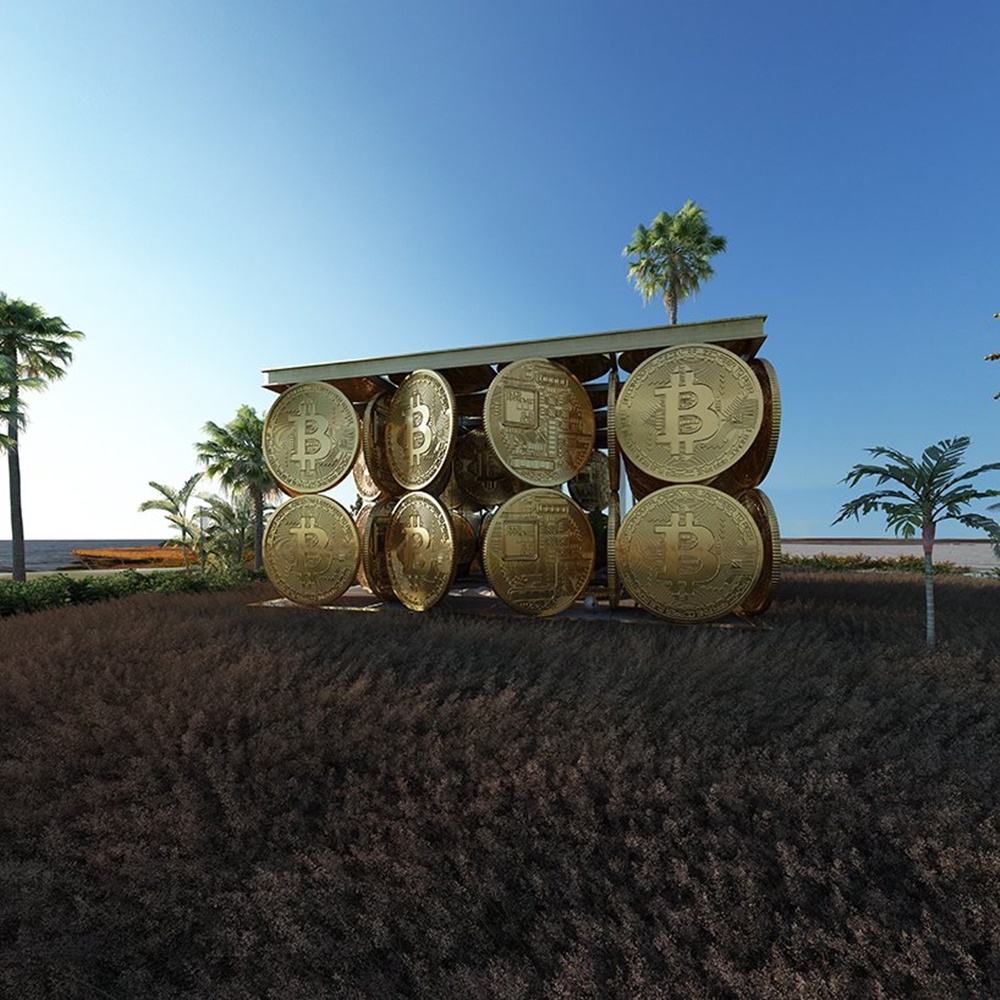 하우스 비트코인은 비트코인을 콘셉트로 만든 구조물인데요. 이는 디지털 세계와 현실의 중간 그 어디쯤 놓여 있습니다. 추상적인 암호화폐인 비트코인을 상징적인 형태와 구조 요소로 바꿔놓은 것이죠. 하우스 비트코인은 주변 환경에 완전히 노출되어 있으며 내부도 뚫려 있는데요. 빙글빙글 돌아가는 비트코인 파사드를 열고 들어가면 겹겹이 쌓여있는 비트코인 위에 황금 의자가 두 개 있으며 이곳에서 자신의 비트코인 세계를 만끽할 수 있습니다.