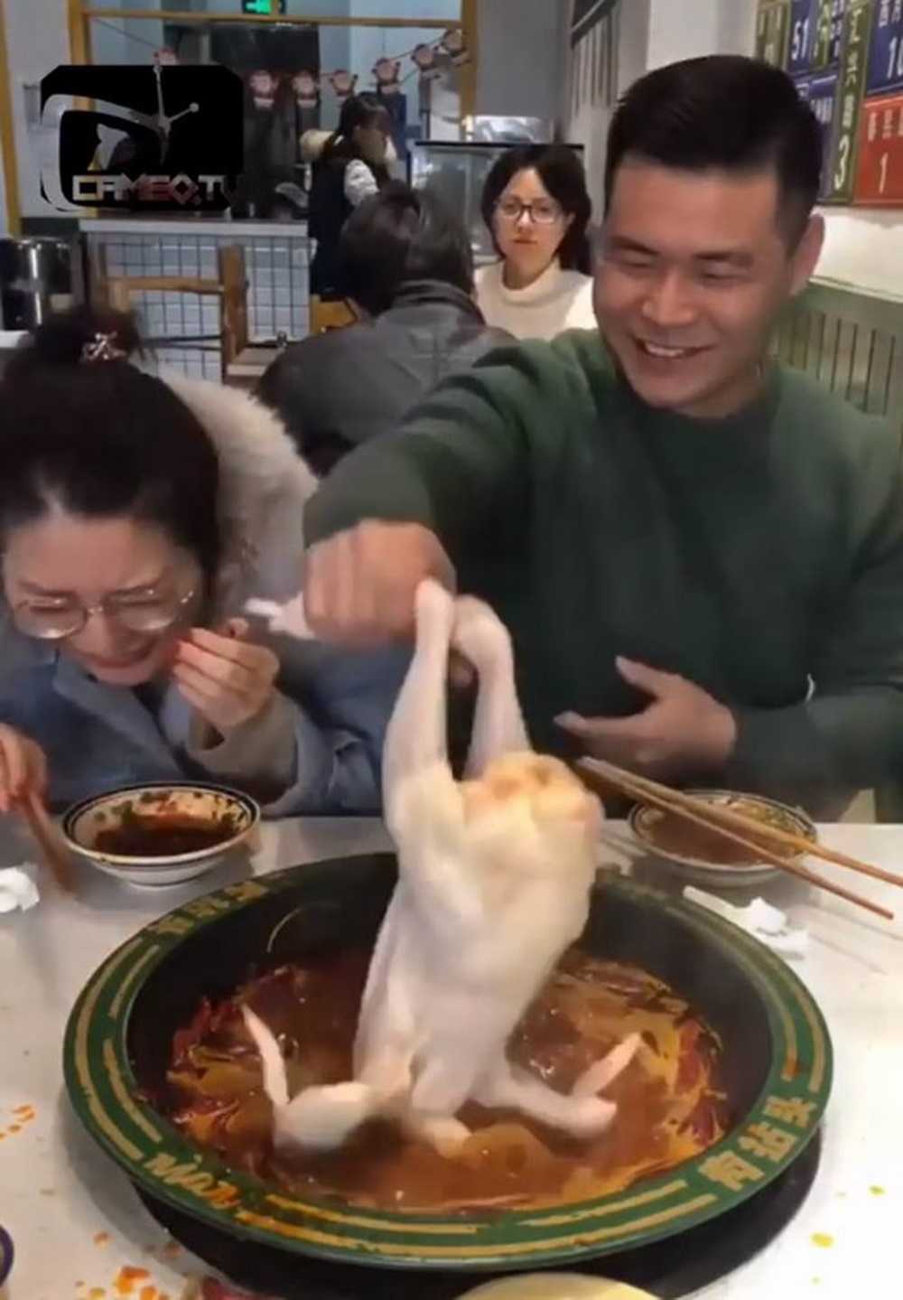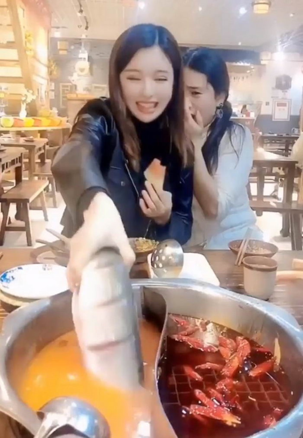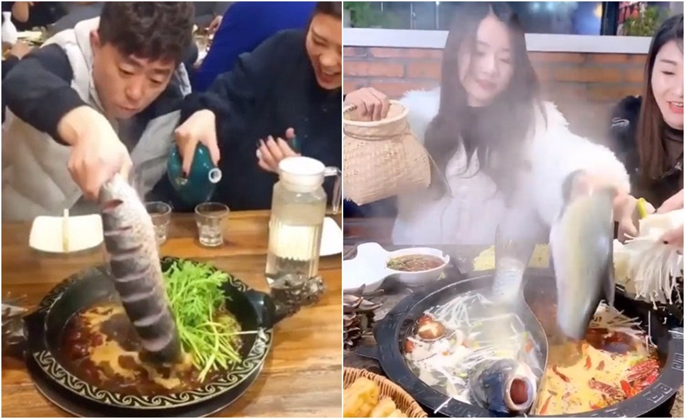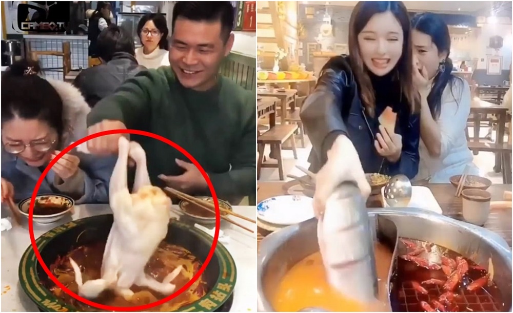 바로 훠궈 육수에 자신이 가져온 식재료를 '종업원 몰래' 넣어 먹는 것입니다. 훠궈 육수에는 보통 얇게 썬 고기, 채소 등을 담가 익히는데요. 빨리 익는 식재료만 넣기에 그리 오래 끓이지 않아도 됩니다. 그러나 훠궈 챌린지에서는 성인 남성의 팔뚝만 한 생선, 혹은 닭 한 마리 등 이해하지 못할 기상천외한 식재료를 넣고 있습니다.