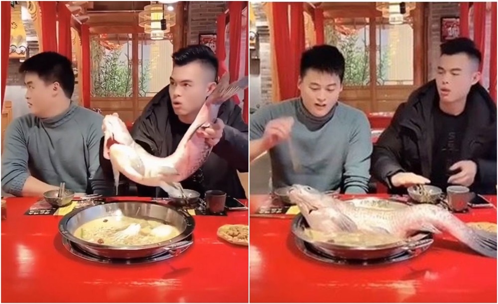 바로 훠궈 육수에 자신이 가져온 식재료를 '종업원 몰래' 넣어 먹는 것입니다. 훠궈 육수에는 보통 얇게 썬 고기, 채소 등을 담가 익히는데요. 빨리 익는 식재료만 넣기에 그리 오래 끓이지 않아도 됩니다. 그러나 훠궈 챌린지에서는 성인 남성의 팔뚝만 한 생선, 혹은 닭 한 마리 등 이해하지 못할 기상천외한 식재료를 넣고 있습니다.