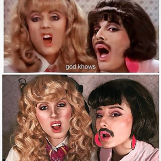 퀸 멤버들이 여장한 것으로도 유명한 <I want to break free>라는 뮤직비디오 장면을 연출했습니다. 자신은 로저리나로 분장한 로저 테일러를, 자신의 친구는 프레데리카로 분장한 프레디 머큐리의 모습을 코스프레했네요.