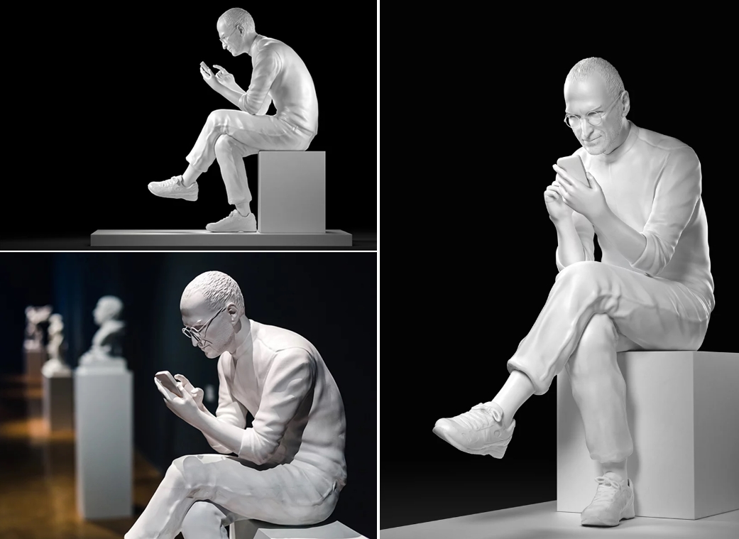 'The Prophet(예언자)'라는 제목의 작품입니다. 누군지 알아볼 수 있으신가요? 바로 스티브 잡스입니다. 스티브 잡스의 트레이드마크인 상의, 안경, 청바지, 그리고 운동화까지 재현해놓았네요. 혁신의 '사과 열매'로 인해 스마트폰 시장의 판도가 바뀌었으며 이를 제목으로 표현했습니다.