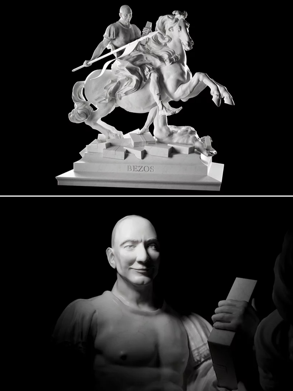 길고 수량이 풍부한 '아마존 강'처럼 다양하고 많은 물건을 팔고 싶었던 제프 베조스는 결국 이를 이뤄냈습니다. 베조스는 택배 상자를 들고 말 위에 올라가 있는 모습으로 보이네요. 무엇을 의미하는지는 관람객이 더 잘 알 것 같네요.