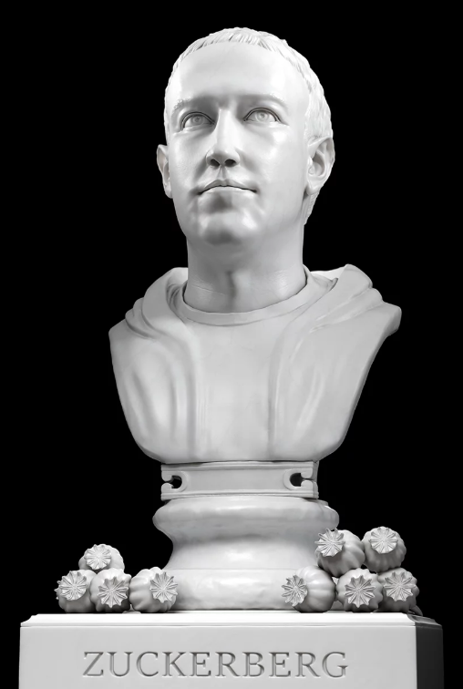 페이스북의 창립자 마크 저커버스의 흉상입니다. 미래를 응시하는 듯한 눈빛과 다부진 입매가 돋보입니다. 마크 저커버그의 흉상에는 'The New Opium(새로운 아편)'이라는 제목이 붙었는데요. 현대인과 페이스북 등 SNS의 떼려야 뗄 수 없는 관계를 표현한 것 같습니다. 그의 흉상 아래에 있는 과일 모양의 것은 바로 양귀비 열매입니다.