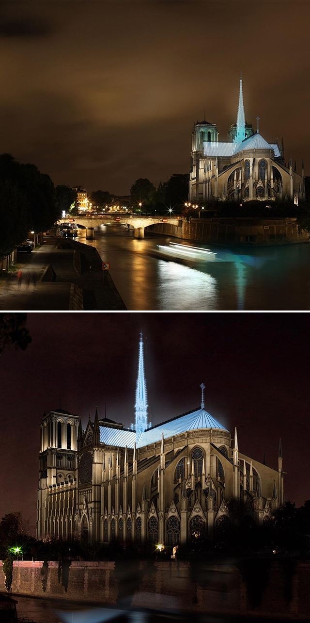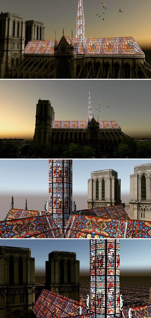 먼저 로마, 파리, 선전(심천)을 기반으로 활동하는 Studio Fuksas에서 내놓은 아이디어입니다. 이곳에서는 노트르담 대성당의 지붕과 첨탑을 바카라 크리스털로 만들어 밤에는 불을 밝혀 아름다운 야경을 만들자는 의견을 냈습니다. 바카라 크리스털은 250년의 역사를 자랑하는 프랑스 럭셔리 크리스털 회사입니다. 크리스털로 만든 첨탑은 역사와 종교의 허무함을, 빛은 무형을 상징한다고 설명하고 있네요.