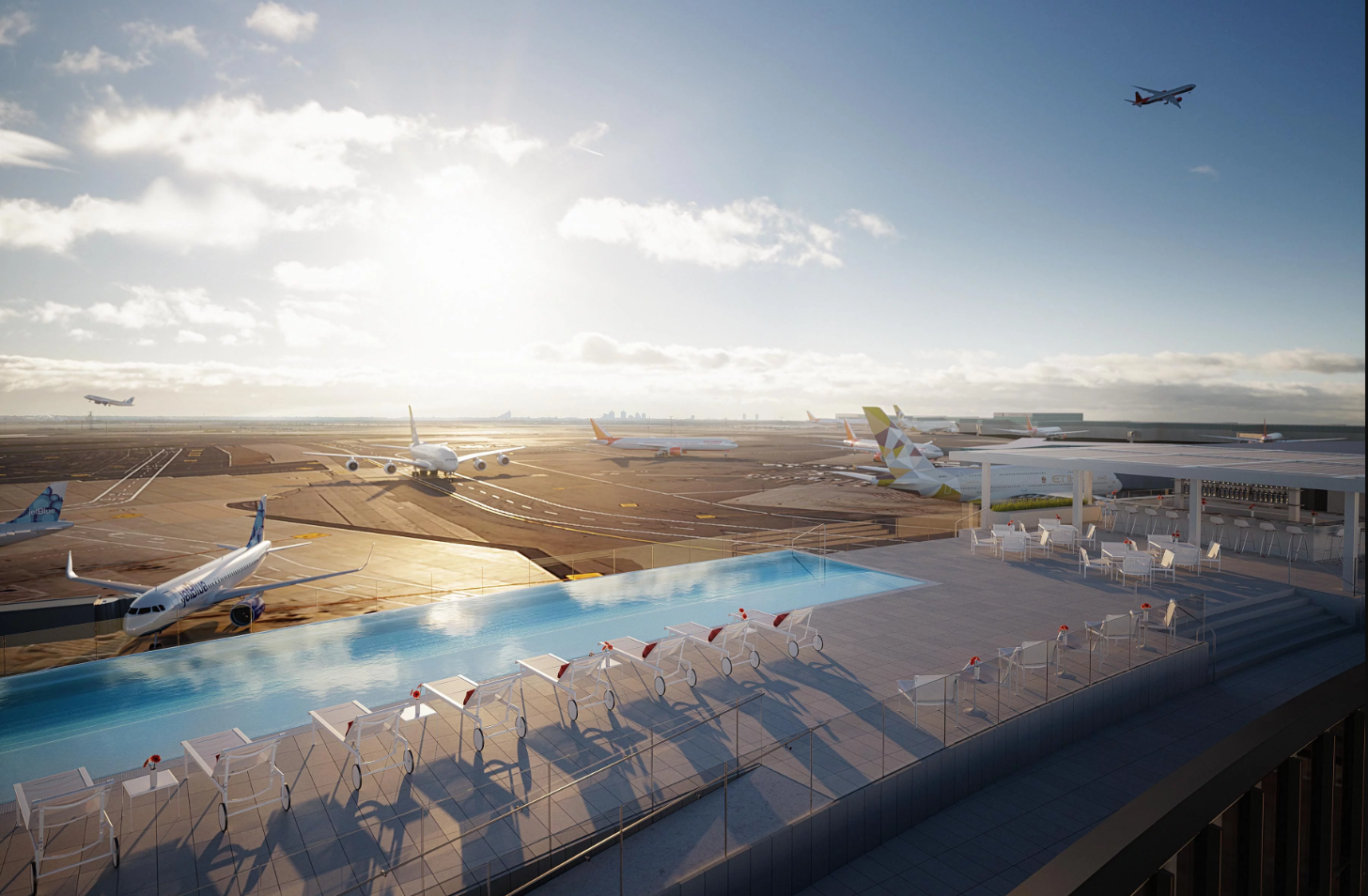 이 수영장은 연중무휴로 개장하며, 풀 바와 전망대도 함께 설치될 예정입니다. 이 수영장은 여름에도 사용할 수 있지만 겨울에도 사용할 수 있습니다. 온수풀로도 활용할 수 있기 때문입니다. 매 30분마다 물이 정화되어 깨끗한 물에서 수영을 즐길 수도 있습니다. 이곳에서는 4 Left/22 Right 활주로를 내려다볼 수 있는데, 이 활주로는 아메리칸 에어라인, 델타항공, 루프트한자 등 주요 항공사들이 이용하는 곳으로 대형 항공기가 이륙하는 모습을 볼 수 있습니다. 날씨가 맑은 날은 활주로 너머에 있는 자메이카만도 보입니다.