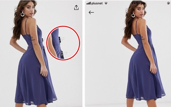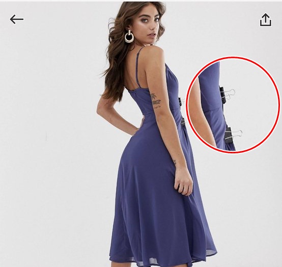 모델의 원피스 앞쪽에 집게를 집어놓아 모델의 허리선을 더욱 타이트하게 만든 것입니다. 로니는 이 사진과 함께 "음.. @ASOS 저 집게 수정하는 거 잊은 것 같은데요.."라는 코멘트를 함께 달았습니다.