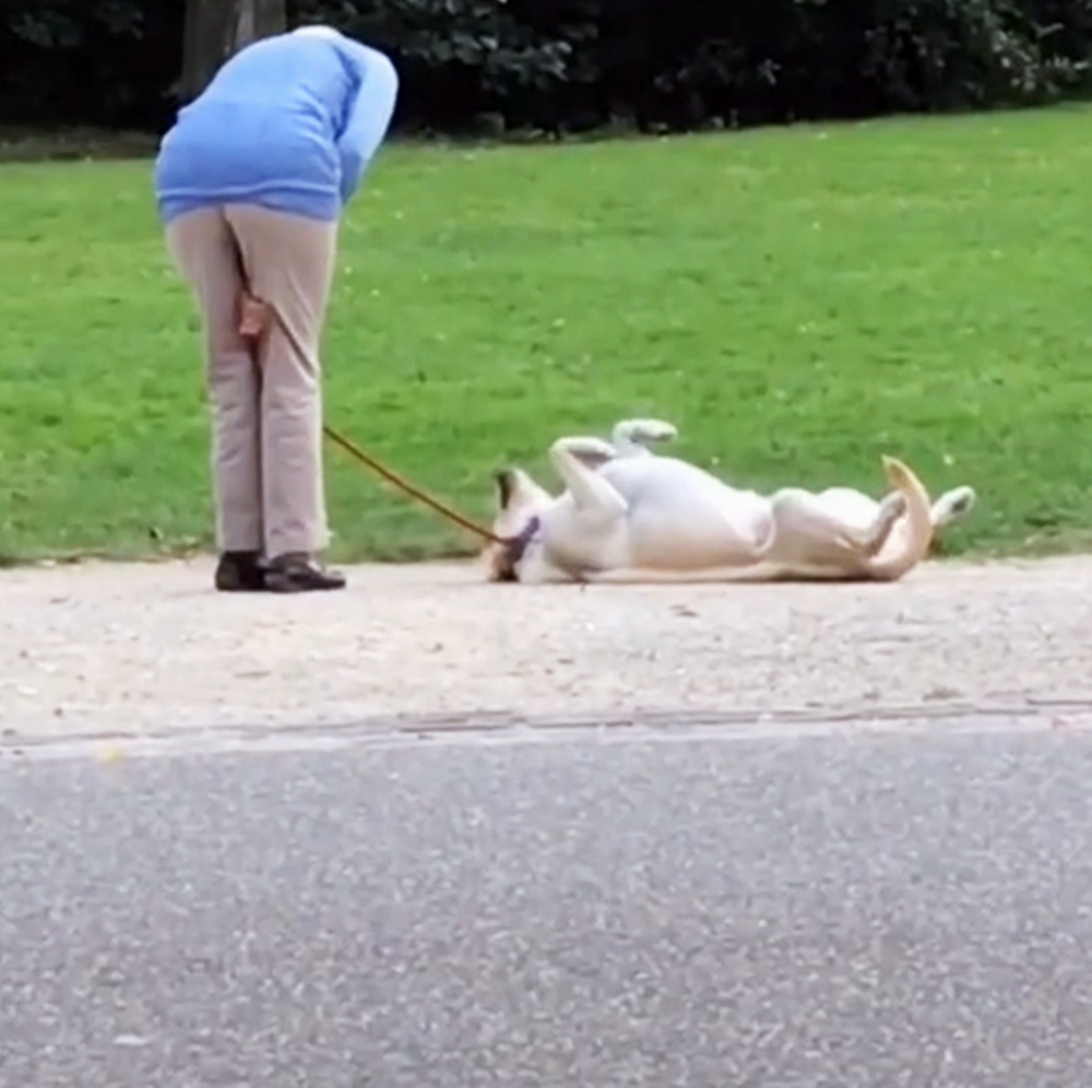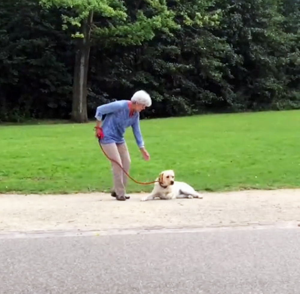 그러나 래브라도의 주인은 이제 집에 가야 할 시간이라는 것을 강아지에게 말하기 위해 줄을 살짝 잡아당겼습니다. 그러나 이 강아지는 이런 주인의 신호를 외면하고 주인의 얼굴도 쳐다보지 않았죠. 주인은 계속해서 가야 한다고 손짓을 하며 줄을 끌어 당겼고, 강아지는 이에 특단의 조치를 취할 수 밖에 없었습니다. 바로 벌러덩 드러눕는 것이었습니다.